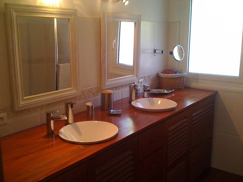 les chambres "des patrons" et "des fleurs" sont desservies par une même salle de bains. Elle est équipée de 2 vasques sur un meuble de rangement en teck, qui abrite et cache, par ailleurs, une machine à laver séchante, et d'une grande baignoire d'angle, avec jets et remous.